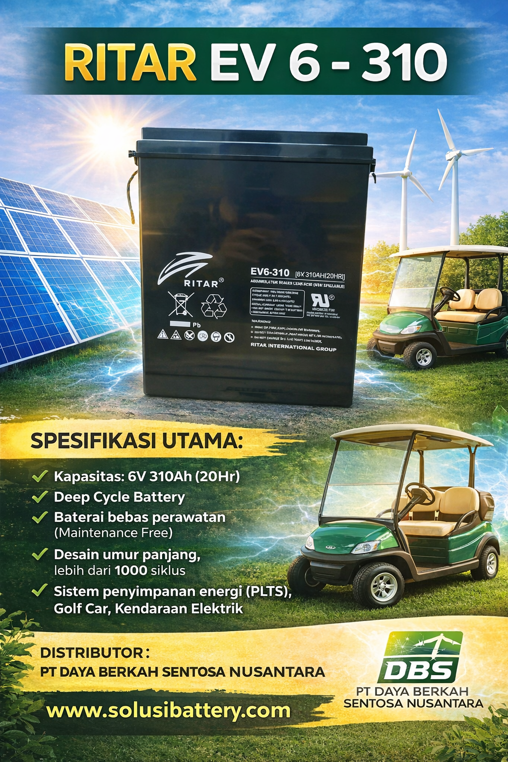 Butuh perhitungan kebutuhan baterai, rekomendasi konfigurasi seri-paralel, atau penawaran harga terbaik untuk Ritar EV 6-310?