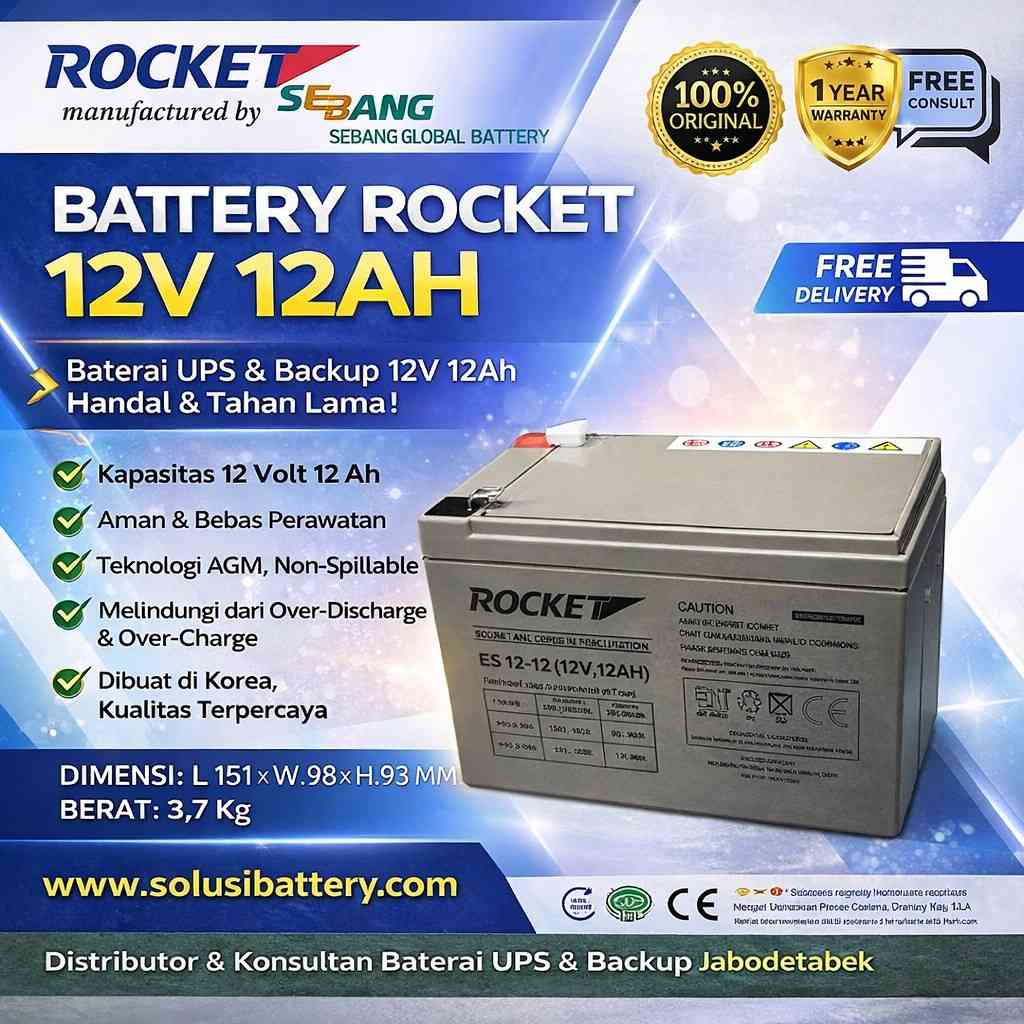 Dengan spesifikasi unggulan ini, Baterai VRLA Rocket ES 12-12 menjadi solusi terbaik bagi pengguna UPS ICA, UPS Riello, dan UPS Laplace yang mengutamakan efisiensi daya, keandalan jangka panjang, dan keamanan sistem energi tertutup.
